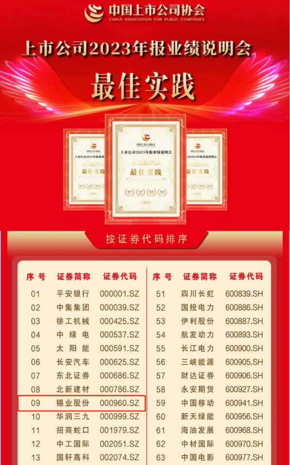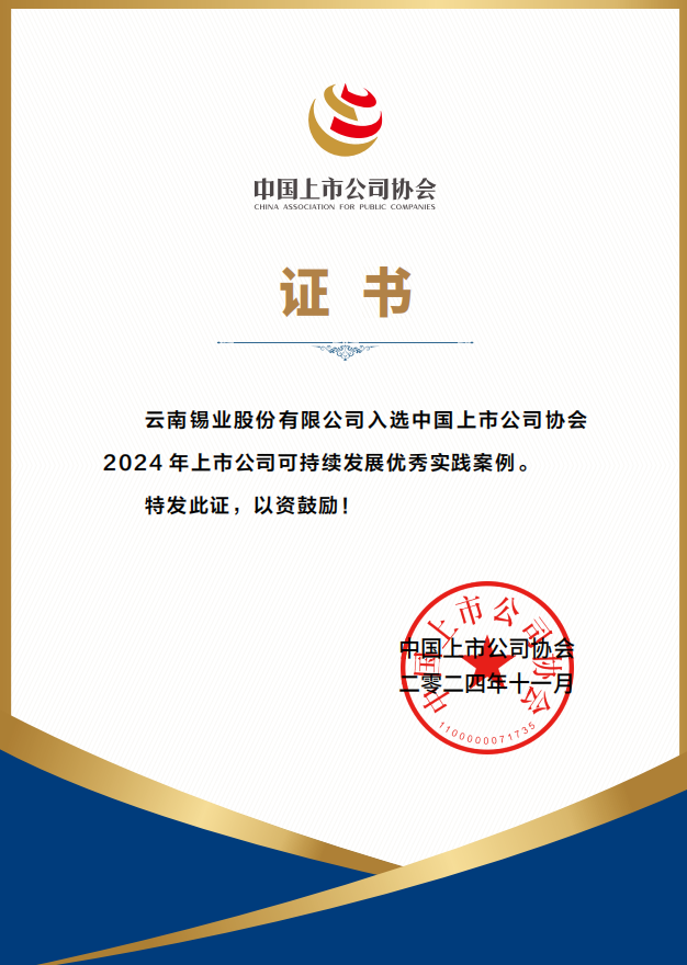 近日,中國上市公司協(xié)會(huì)發(fā)布“2023年報(bào)業(yè)績說明會(huì)最佳及優(yōu)秀實(shí)踐”和“2024中國上市公司可持續(xù)發(fā)展最佳實(shí)踐案例”。錫業(yè)股份成功入選“2023年報(bào)業(yè)績說明會(huì)最佳實(shí)踐”,這也是公司第三次入選該榜單;“數(shù)智引領(lǐng) 以信息化賦能產(chǎn)業(yè)環(huán)節(jié)高質(zhì)量發(fā)展”案列成功入選2024上市公司可持續(xù)發(fā)展優(yōu)秀實(shí)踐案例。
